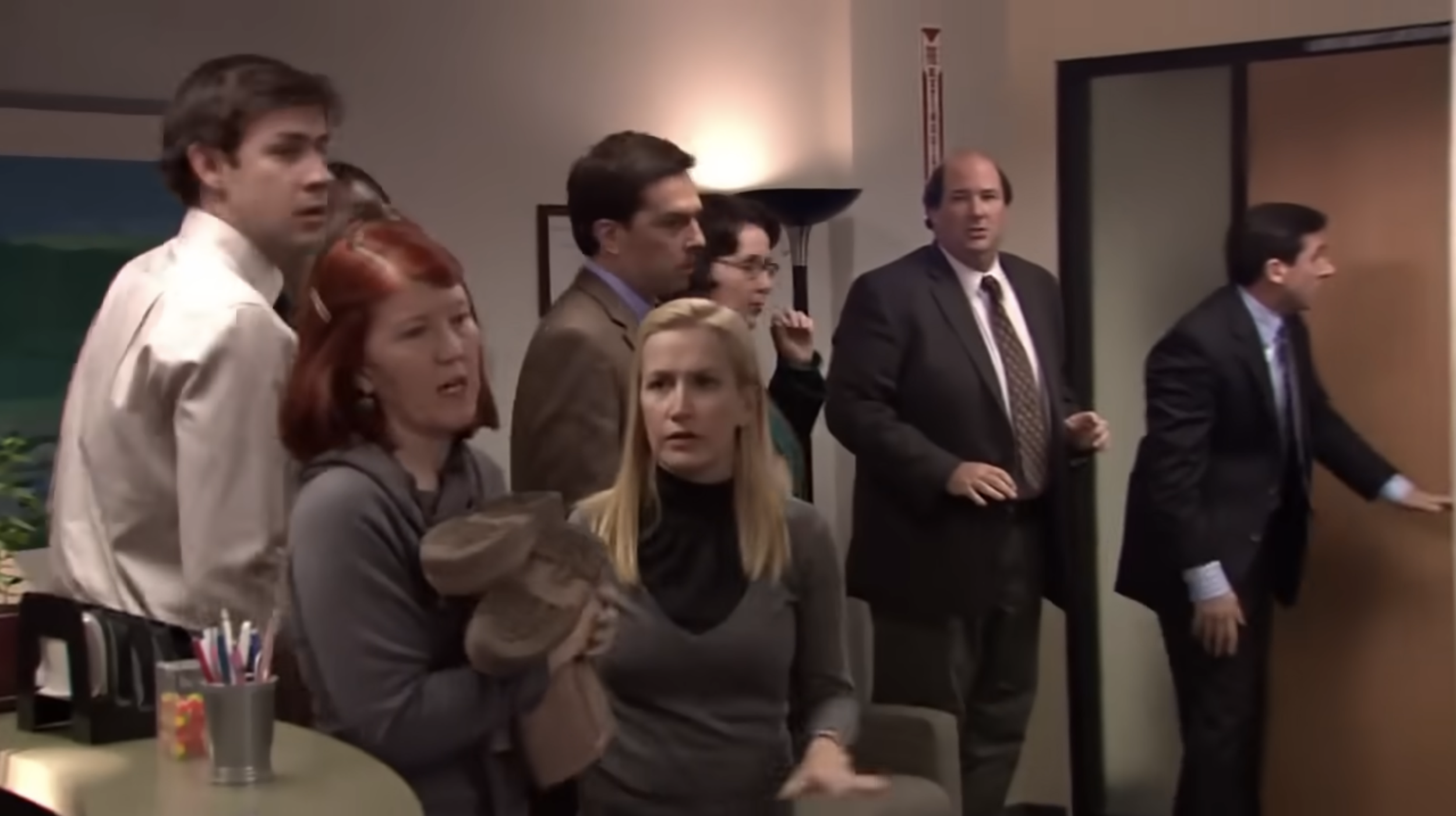 When the “fire” begins, the camera captures the employees’ confused reactions through medium and close-up shots, allowing the audience to see each character’s unique response. These individual reactions—confusion, panic, frustration—are crucial for setting up the chaotic mood and the humour. As panic sets in, the camera work becomes more dynamic, using handheld shots and quick cuts to simulate the frantic energy in the room. At one point, the camera operator seems to be knocked down by all the characters as they run away from the door badck into the office. This shaky, handheld technique immerses the audience in the scene’s chaos, making it feel like they’re experiencing the panic along with the characters. Several close-ups (e.g., on Angela as she attempts to save her cat) heighten the comedic impact by zeroing in on each character’s personal, often irrational, reaction to the crisis. This use of close-ups captures the manic energy and desperation of each character. The wide shots are strategically used to show the full scope of chaos in the office. For instance, when Michael throws a chair through the window or when characters run around aimlessly, these wide shots emphasize the collective panic and allow the audience to see how each character contributes to the mayhem.